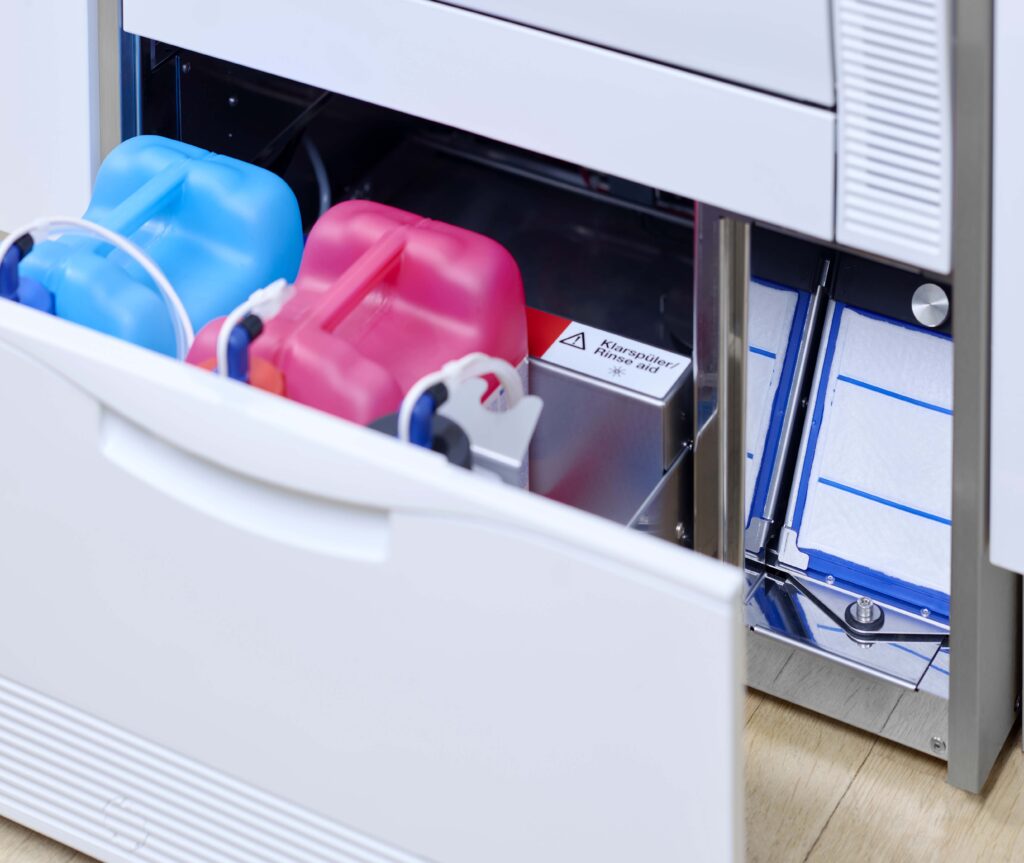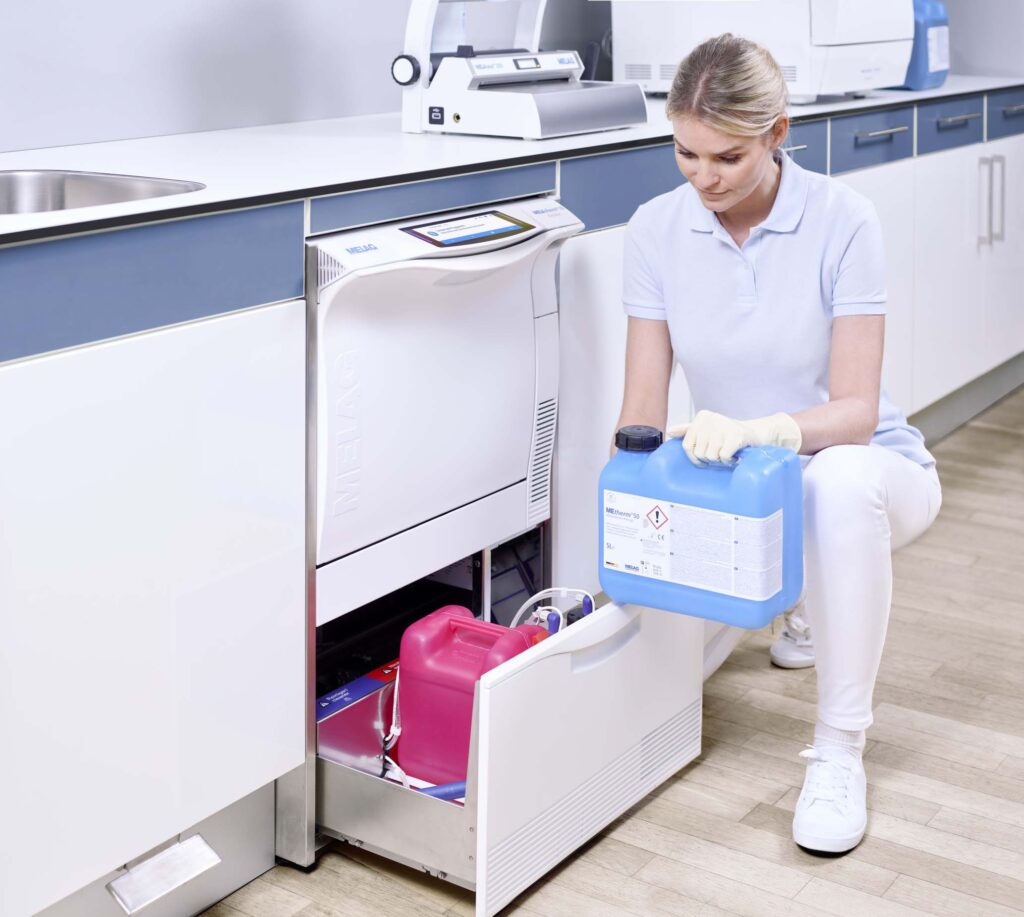 Vyvinuté speciálně pro mycí a dezinfekční myčky MELAG, naše procesní prostředky MEtherm® (čisticí prostředky, neutralizátory a oplachovací prostředky) zaručují nejlepší výsledky čištění a sušení s minimální spotřebou. Vyzkoušejte výhody těchto procesních činidel a jejich dokonalé sladění s mycími a dezinfekčními zařízeními MELAG.