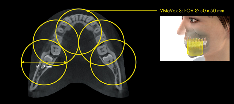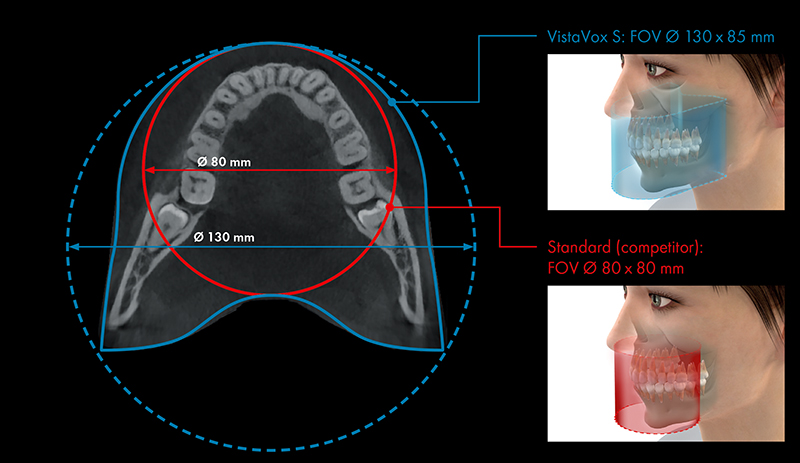 Dostatečně velké FOV pojme obě čelisti, 20 vrstev OPG snímku zaručí perfektní obrázky i při nedokonalé pozici pacienta. Intuitivní a moderní software VistaSoft je možné instalovat na neomezený počet klientských počítačů, propojit s ordinačním softwarem a doplnit dalšími moduly (Plánování implantátů a propojení s CAD CAM: modul VistaSoft SICAT (s Cerecem) / VistaSoft Implant ve spolupráci s EXOCAD, ortodontické plánování: VistaSoft Trace) podle potřeby.